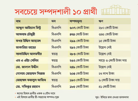 শীর্ষ ১০ ধনী প্রার্থীর মধ্যে সাতজনই বিএনপির মনোনীত। সপ্তম স্থানে রয়েছেন চাঁদপুর–২ আসনের প্রার্থী মো. জালাল উদ্দীন, যাঁর সম্পদের বাজারমূল্য ২৪৯ কোটি টাকা।